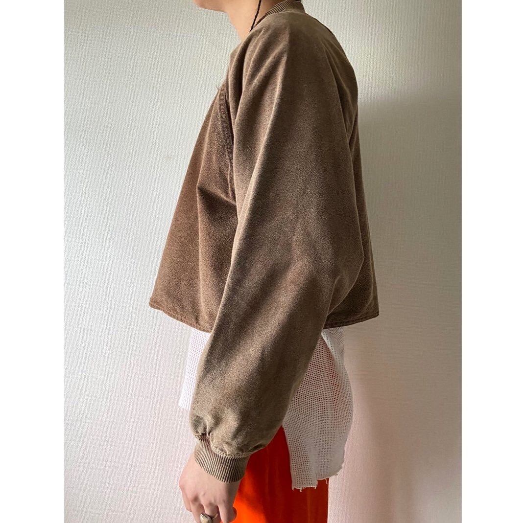 紙タグも染められているのでオーバーダイかと 製品染め特有のムラ感とクタっとしたシャモア風コットン 触るとふわふわしていますが、遠くから見るとスウェードレザーという面白い生地感