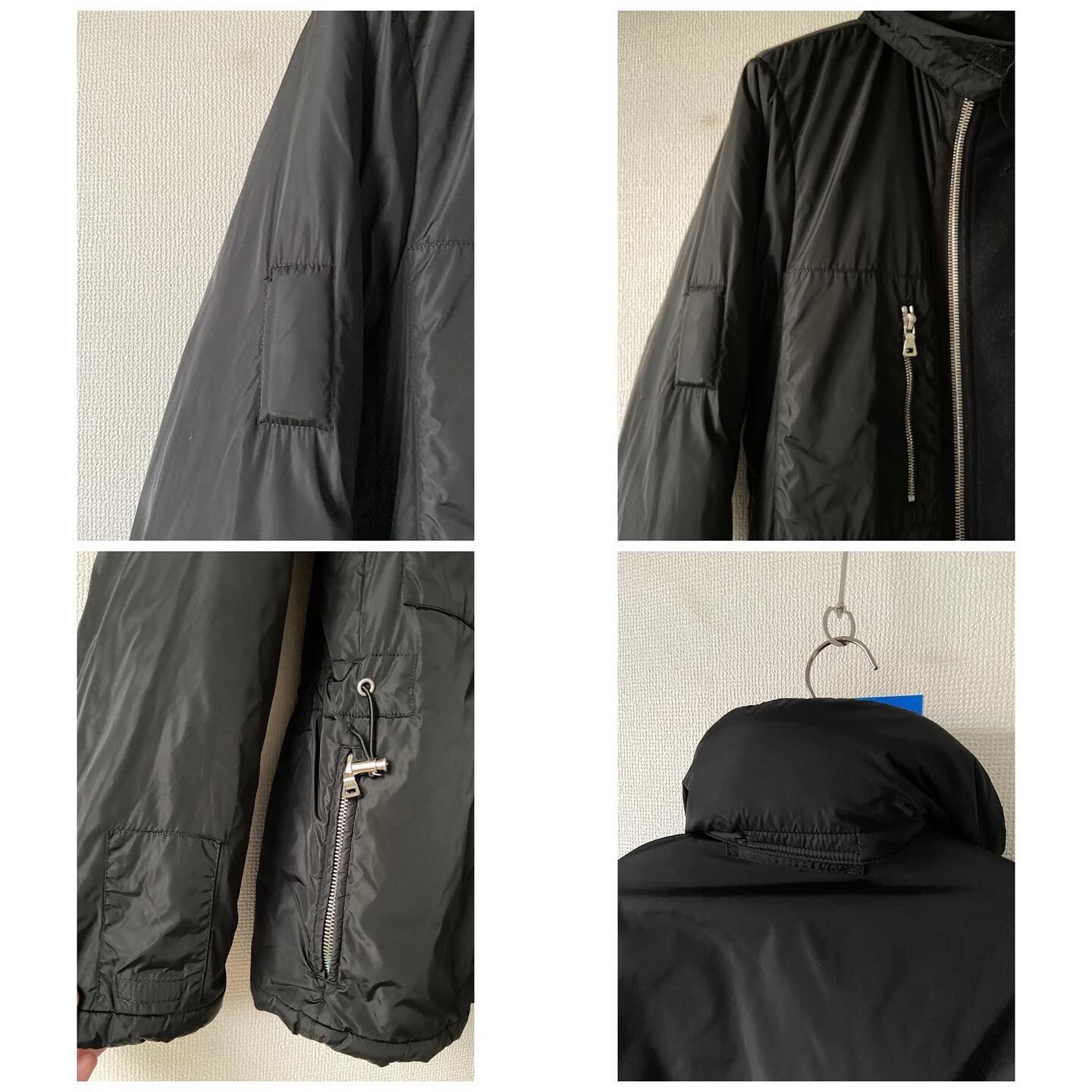 艶やかなツヤ感のあるブラックナイロンシェル 真冬仕様の中綿入り 流石プラダ暖かく軽い素材を使っています 襟裏、前立てはウールの切り替え 右襟横はフリース仕様