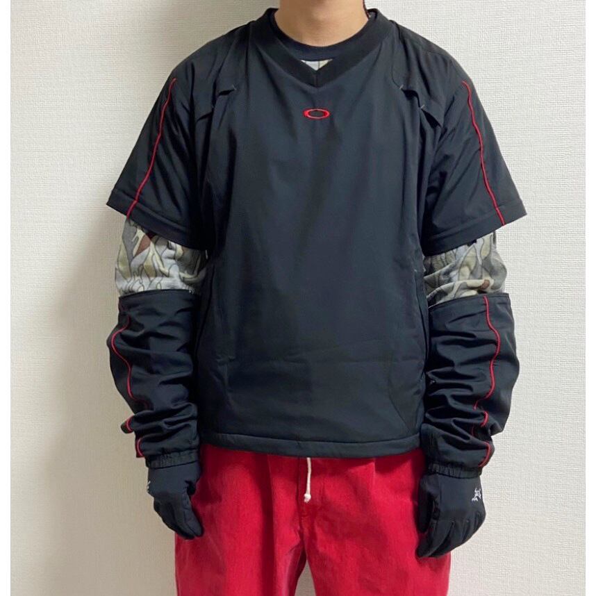デタッチャブル仕様のアーム リブvネック 所々にグレーのステッチ 胸とアームと首裏の刺繍ロゴ、パイピングは赤となります 脇には通気口