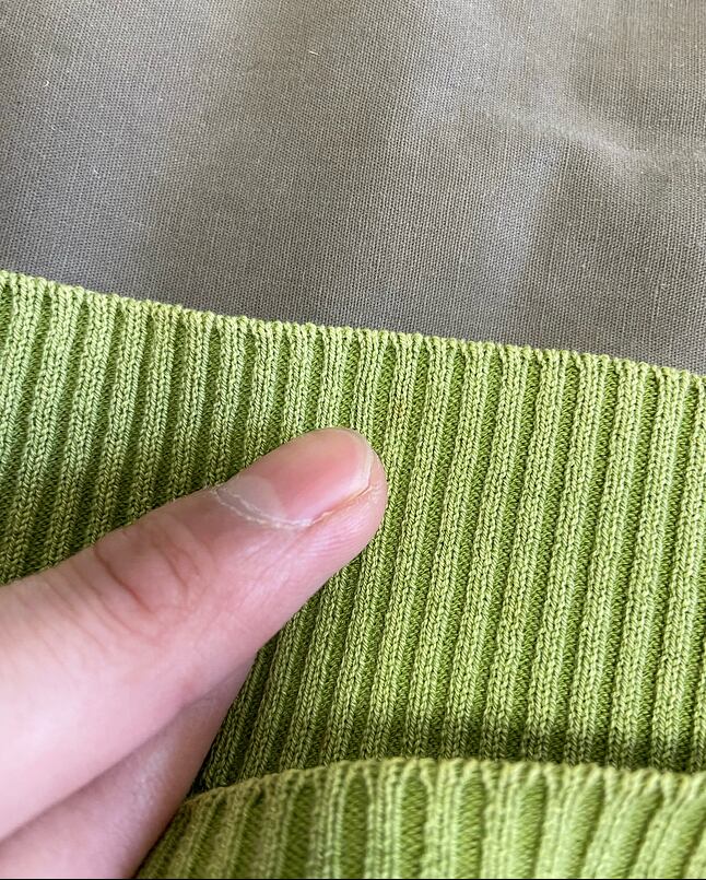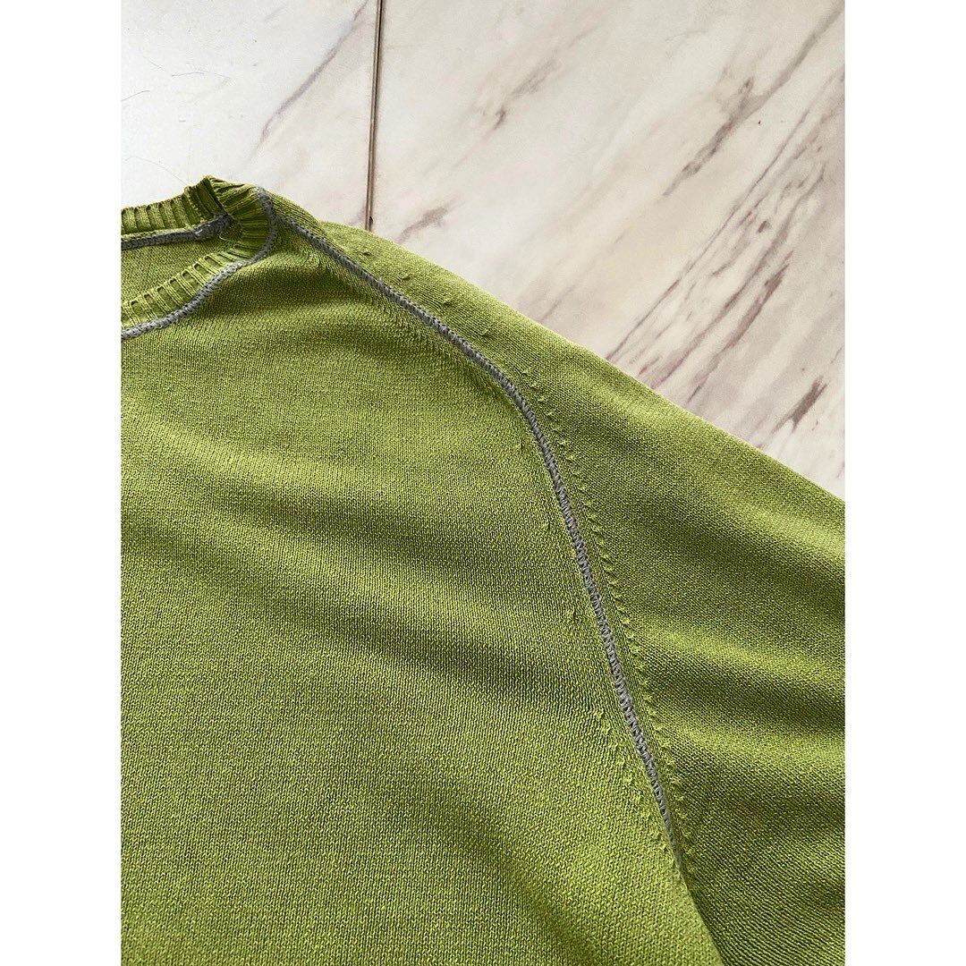 春らしい発色の良い黄緑色にグレーの糸を使ったシームがよく映えます ラグランスリーブともまた違う変型ショルダー いずれにしても肩の落ち感が素晴らしい