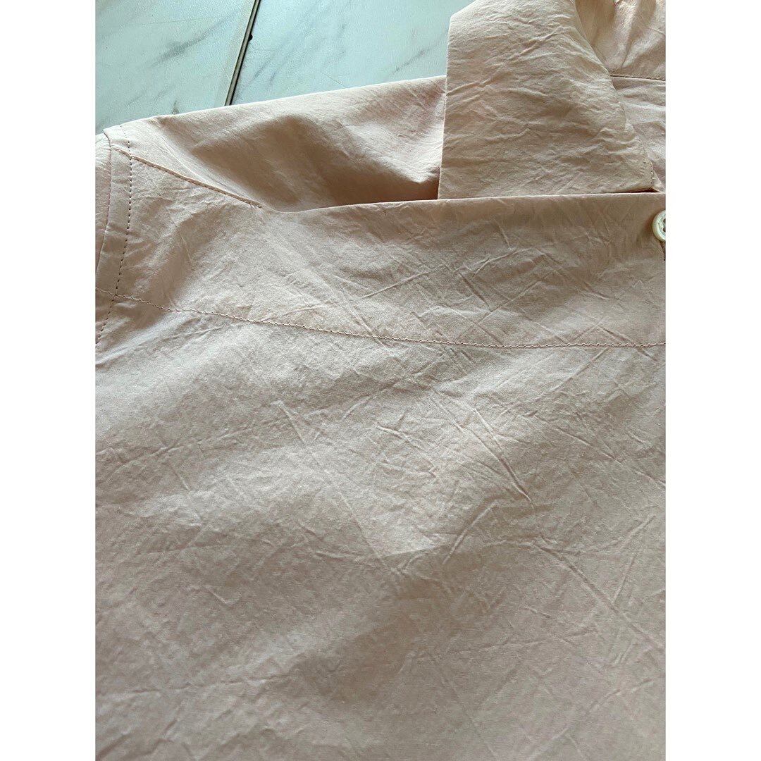 少しシワ加工のかかった生地の表情がミルキーピンクという優しい色味を引き立てます 胸ポケット付き