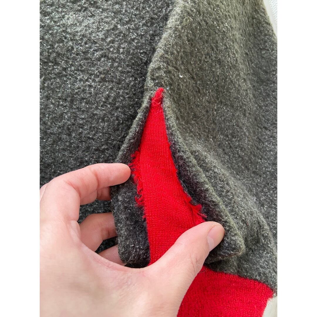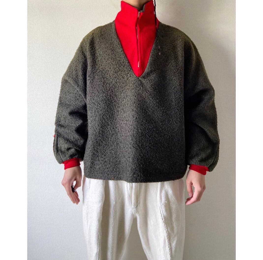 ふわふわの毛足長めのフリースウールボア チクチクしません ハーフジップハイネック オリーブグリーンから発色の良い赤への切り替え 裾マチ、袖口にも切り替えが施されています