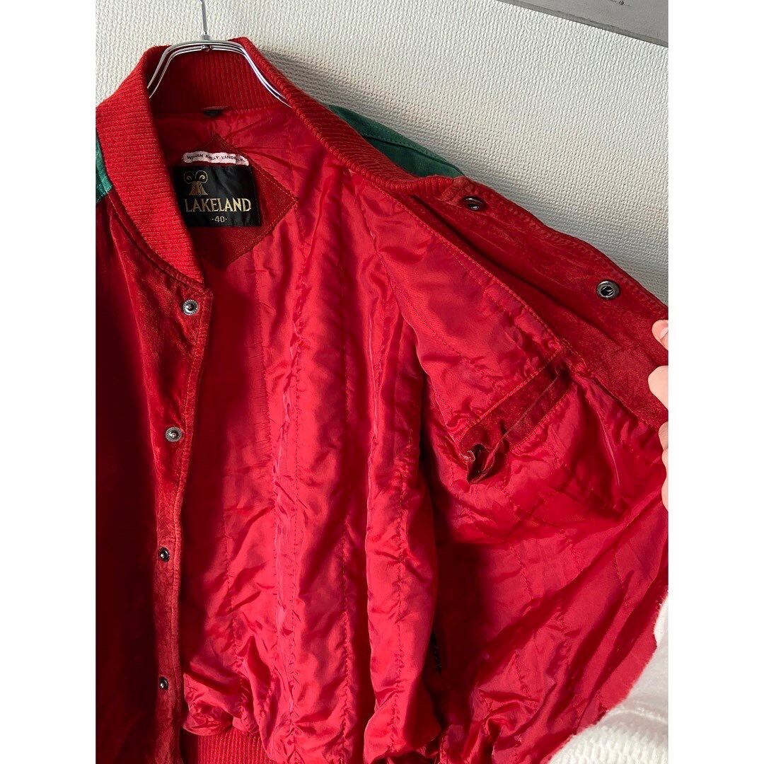 本革ヌバックレザー 濃い赤×濃い濃いのミントグリーンの切り替え こんな配色見たことない スタジャン型 無駄なワッペンなどないところも◎