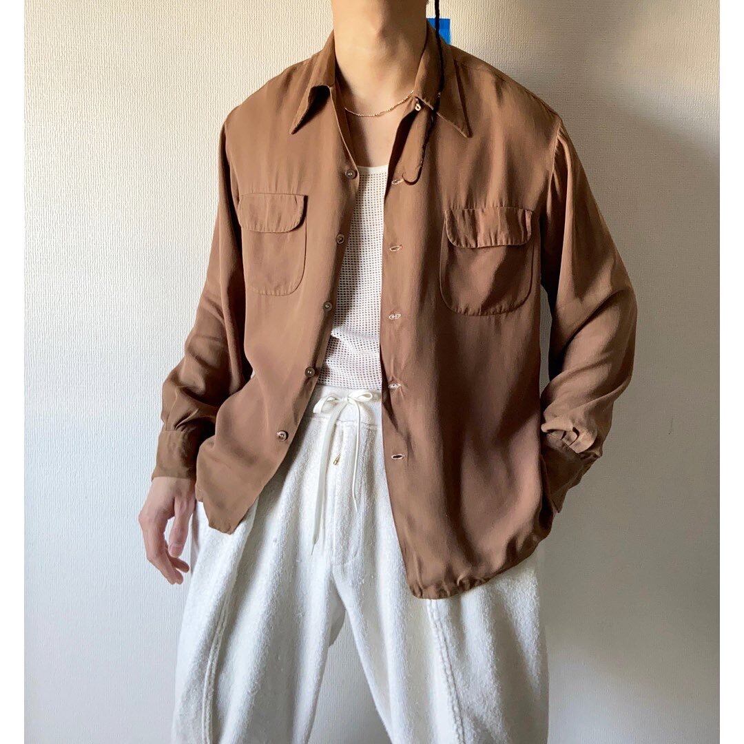 40s 〜 50s Broadstreet's mocha brown rayon gabardine cross open collar box shirt