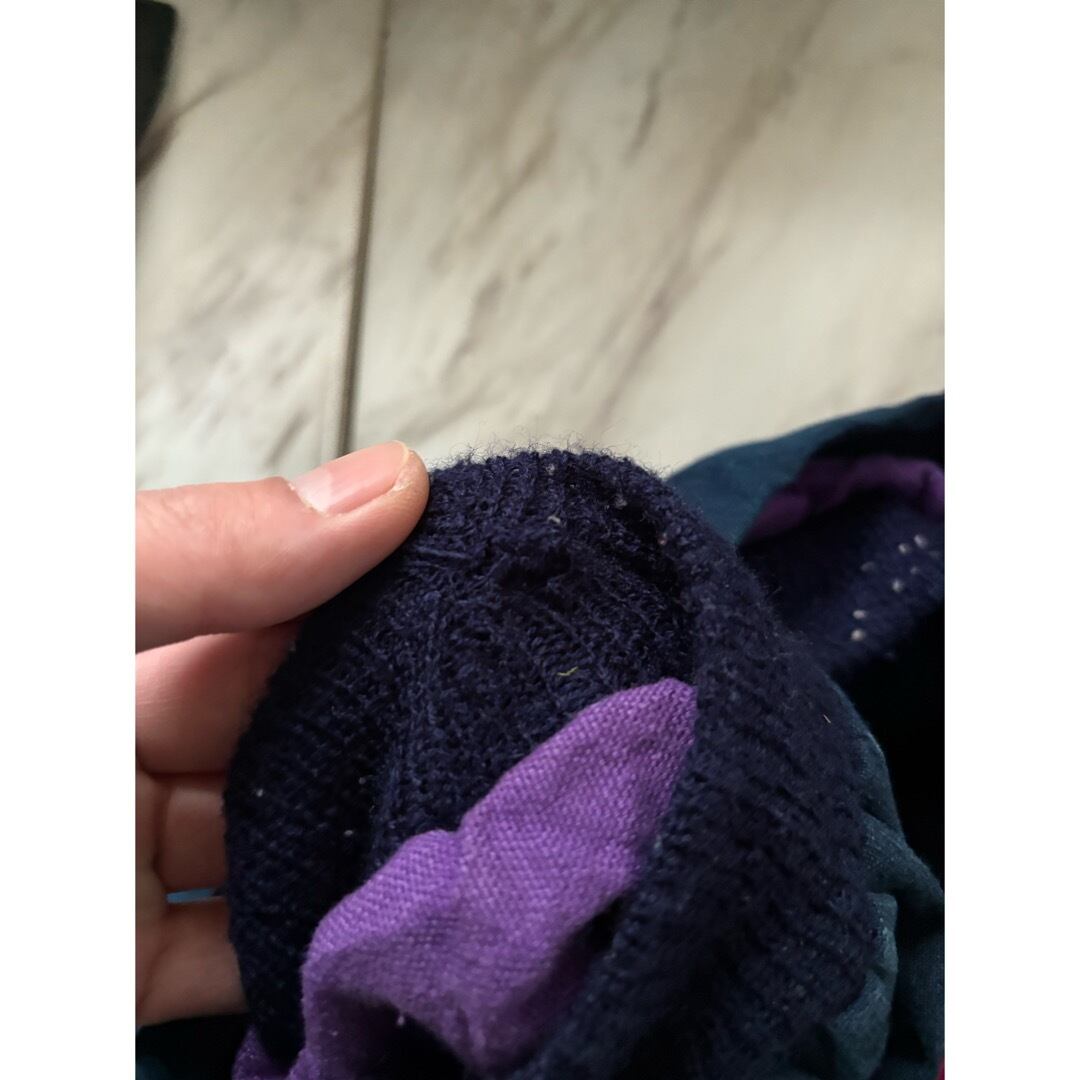 左お腹、表の右袖先内側に小さなアタリ リブ内側ですが毛玉感 ほつれ 裏地にシミ箇所