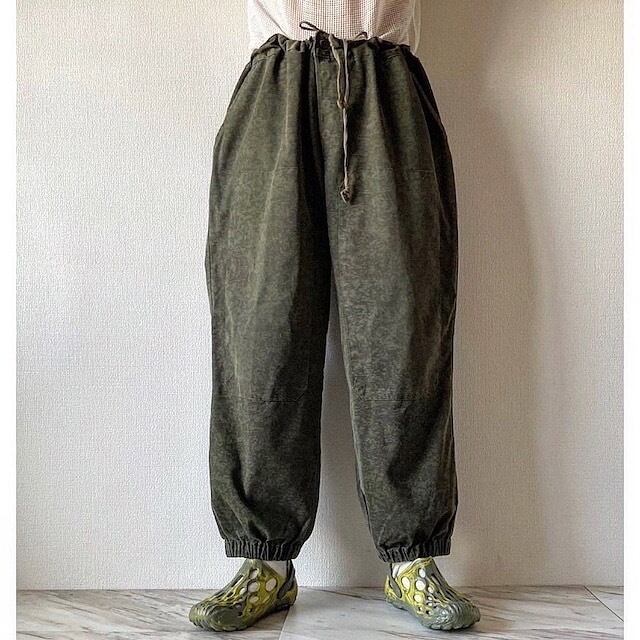 ウエストはドローコード付きのイージー仕様 極太でオーバーパンツの様な見た目ですが、きちんとサイドポケット、ケツポケあります 整備士が膝を付いて作業する事が多いので、腿から膝下まで2重生地となっています 裾はリブ仕様