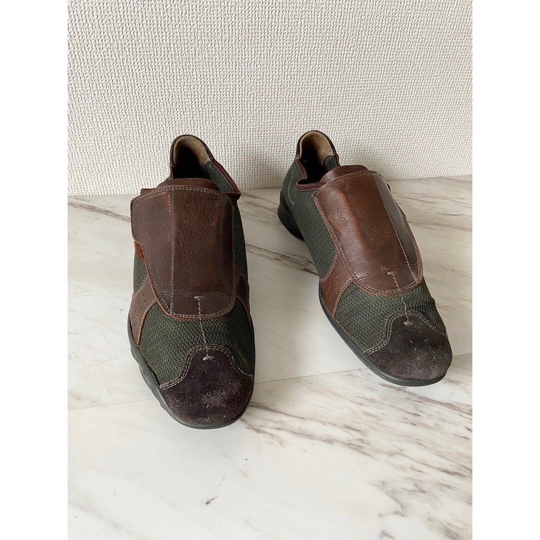 トゥはブラウンスウェードレザー アッパー部分はブラウンレザーベルクロ仕様 開けるとゴムが出てきます それ以外の部分はオリーブグリーンメッシュ仕様なので、通気性が良く夏に最適です