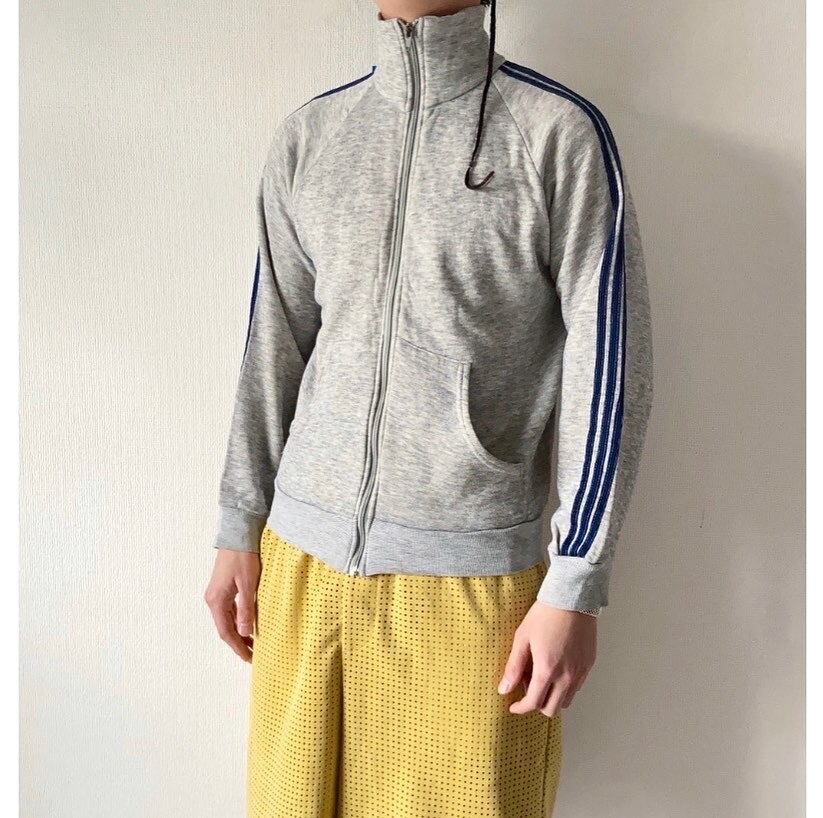 70年代後半〜80年代特有のアクリル素材のトラックジャージ 沢山洗われて繊維が見える感じが良いですね 霜降りグレー×ネイビーライン ポケット付き