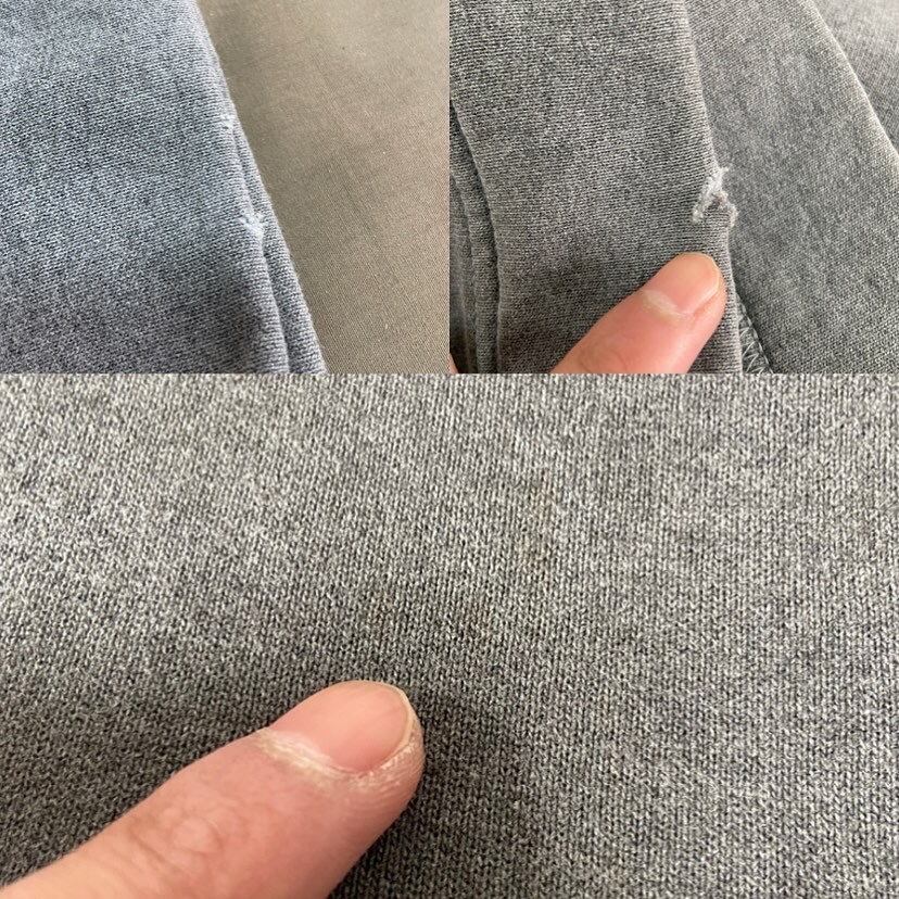 タグも染められたオーバーダイ 特有のムラ感のあるボディー コンクリートグレーにライトグレーのステッチデザイン