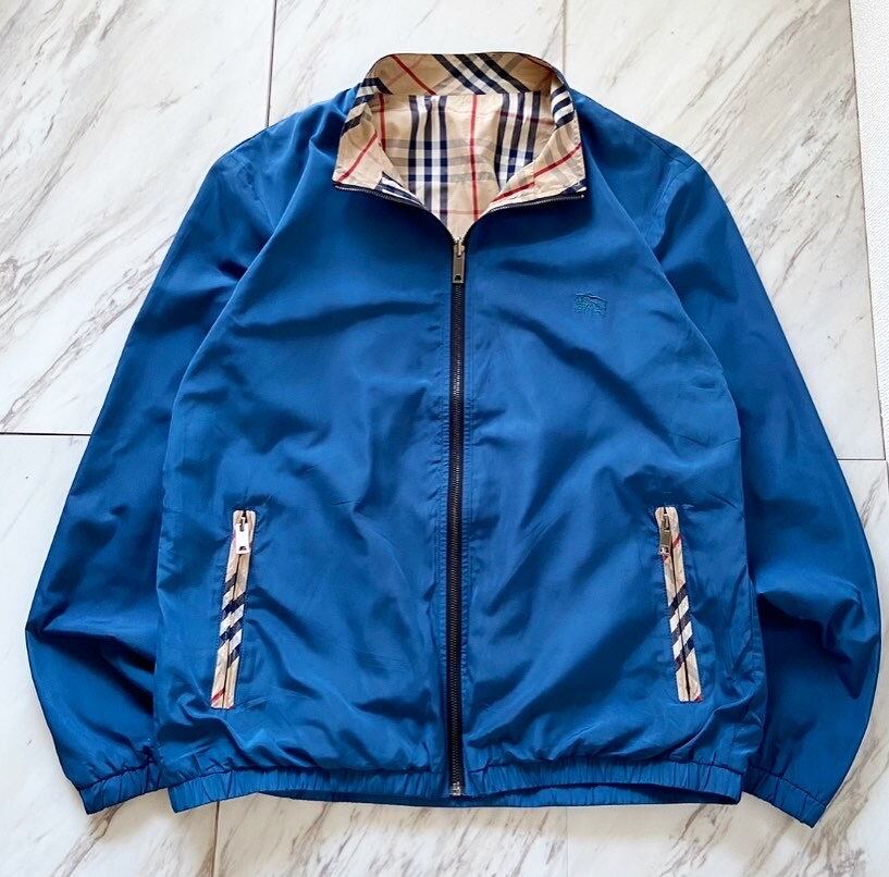 A面はロイヤルブルーの艶めくナイロン地 B面はバーバリーチェックのナイロン地 両胸刺繍ロゴ