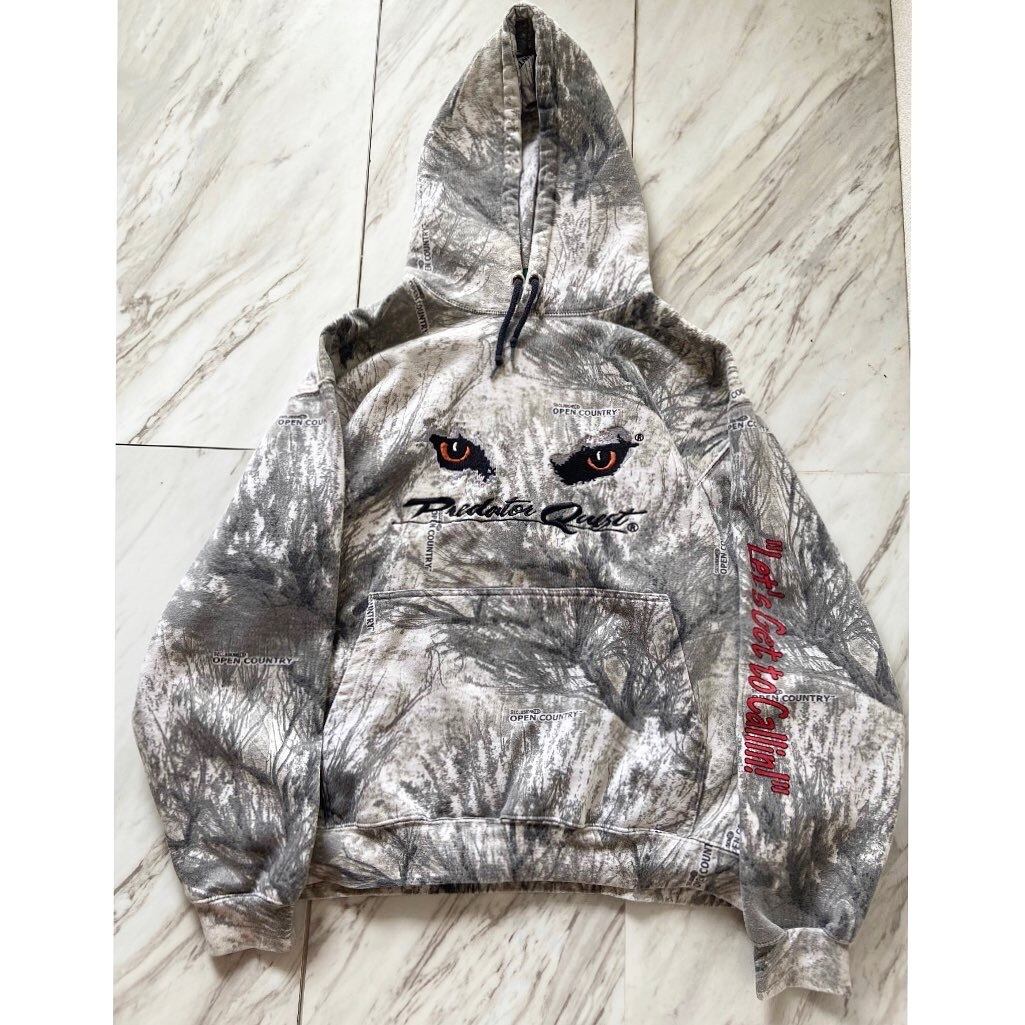 グレーホワイトの雪山を連想させる珍しい色味のリアルツリーカモ フロントにシルバーとブラックで刺繍された動物の目 鷹?豹? 左袖に赤の袖プリ "Let's get to Callin!"