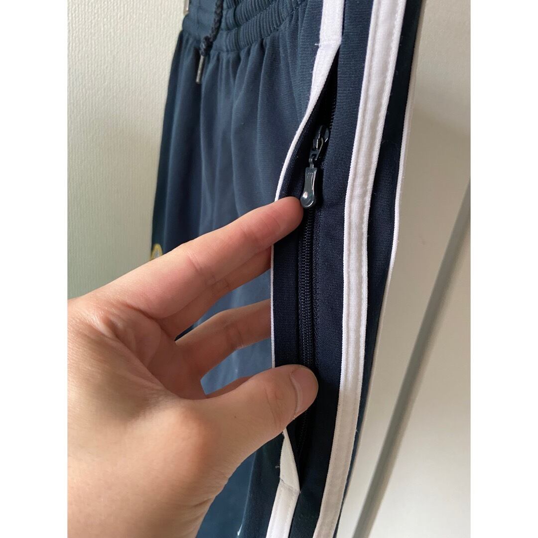 パンツはダークネイビー×3サイドライン 腿部分にエンブレムと刺繍ロゴ サイドジップポケット リブ仕様の裾口にはジップが付いているので靴下で遊べます ウエストはドローコード+ゴムのイージーパンツ仕様