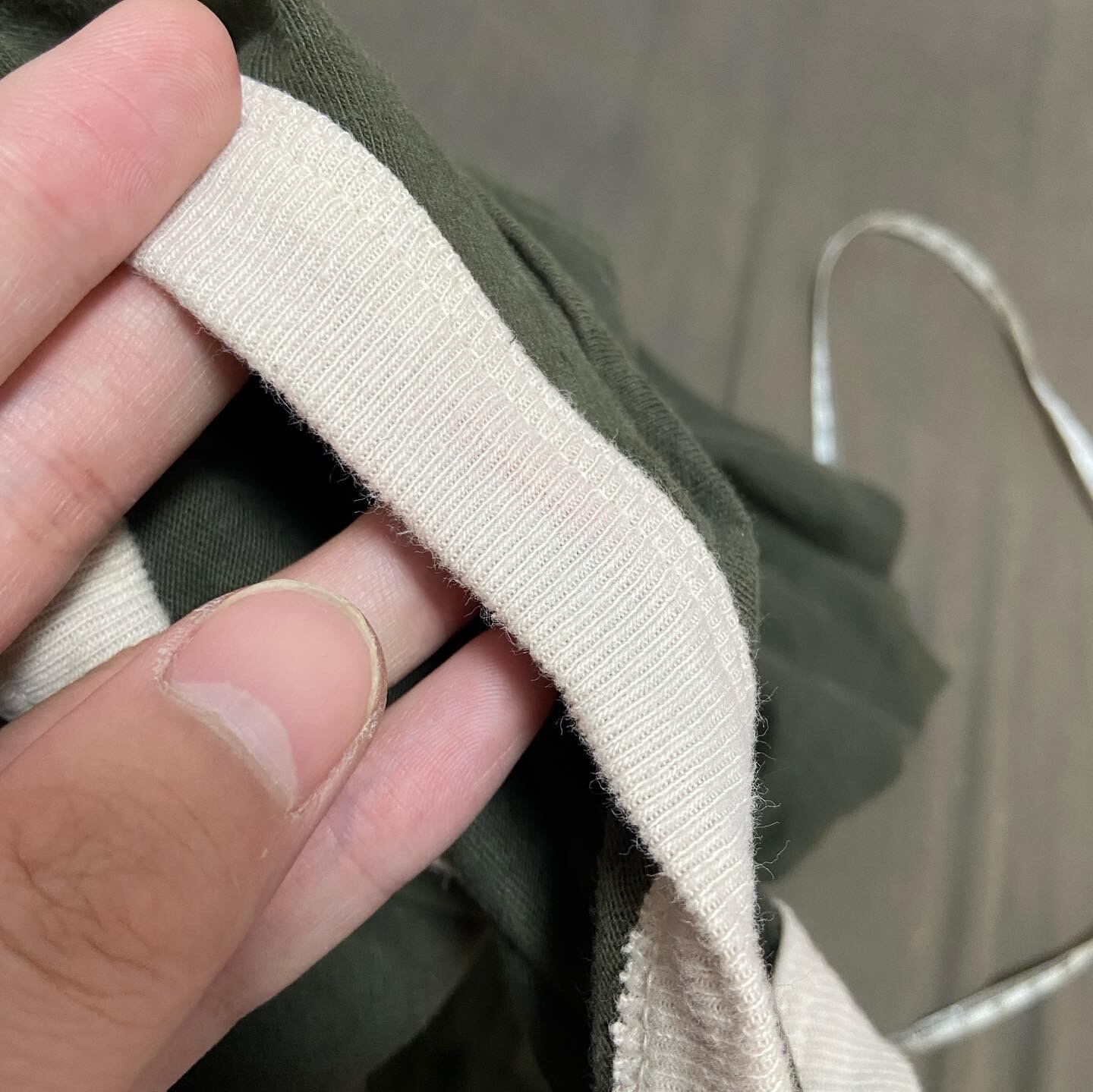 濃いオリーブグリーンとブラウンの間の様な退廃的カラー 首元、袖口はオフホワイトの切り替え