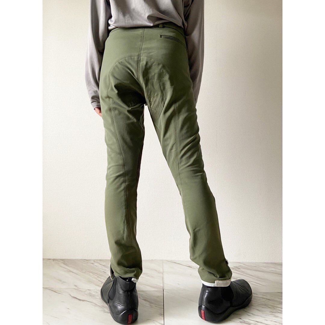 艶やかなオリーブグリーン ジョッキーズパンツなので擦れが生じる箇所(膝とお尻)にレザーパッチ、ギザギザステッチが付いています レザーの退廃グレーのグラデーションも良し