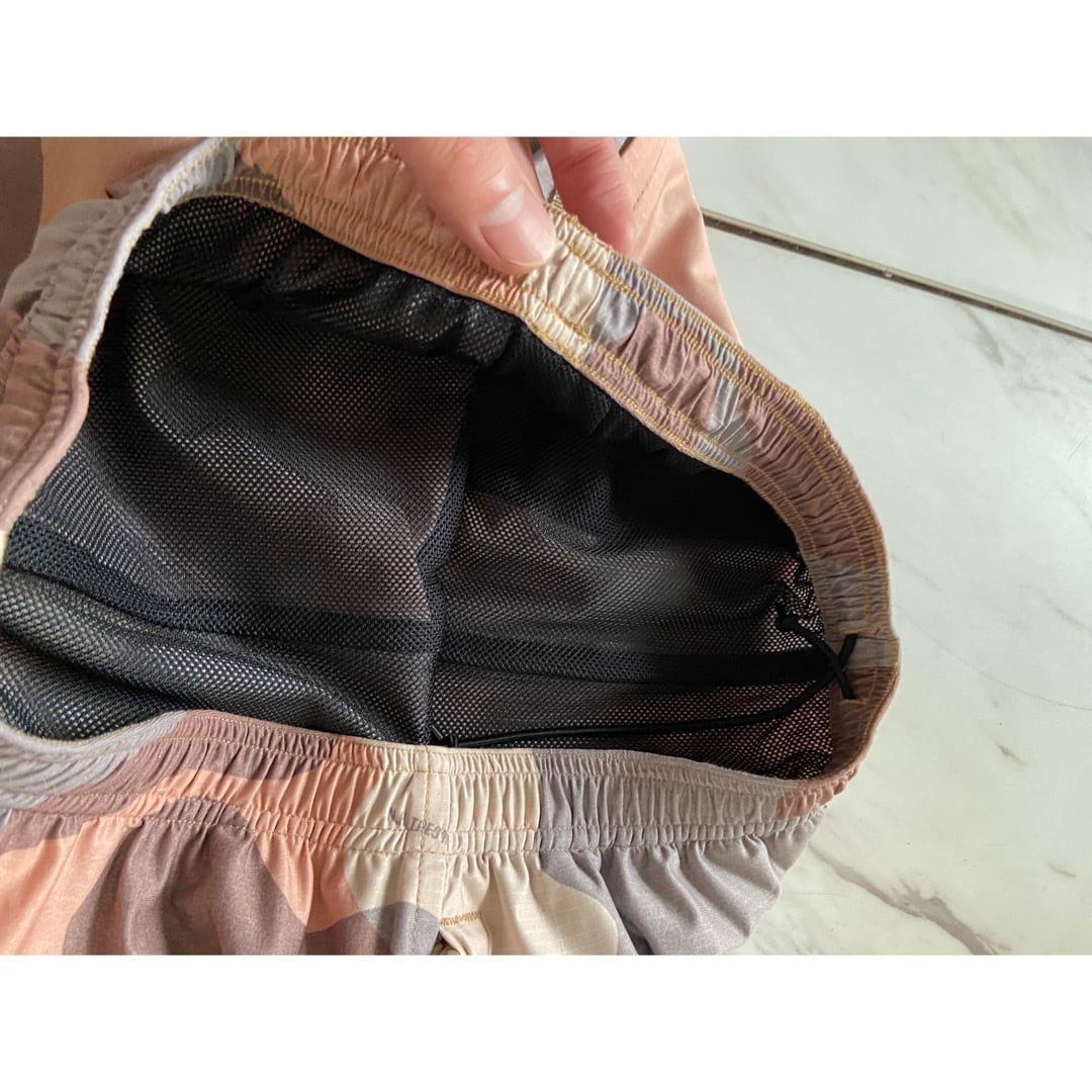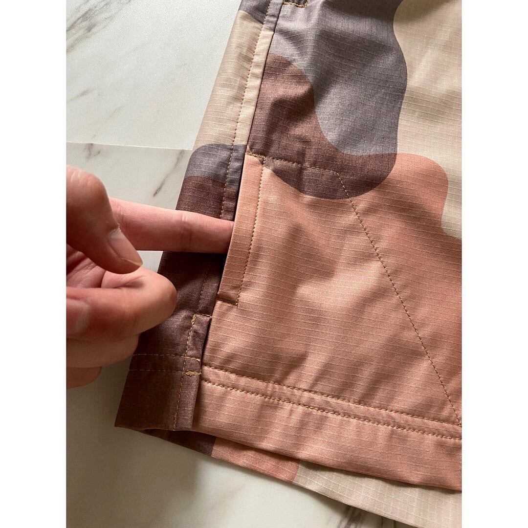 短めの丈感 わたりにたっぷりとボリュームを持たせたゆったりとしたシルエット バギーショーツやスイムショーツの様なシルエット 撥水や防風性を兼ねそろえた、ポリエステルリップストップを使用しています