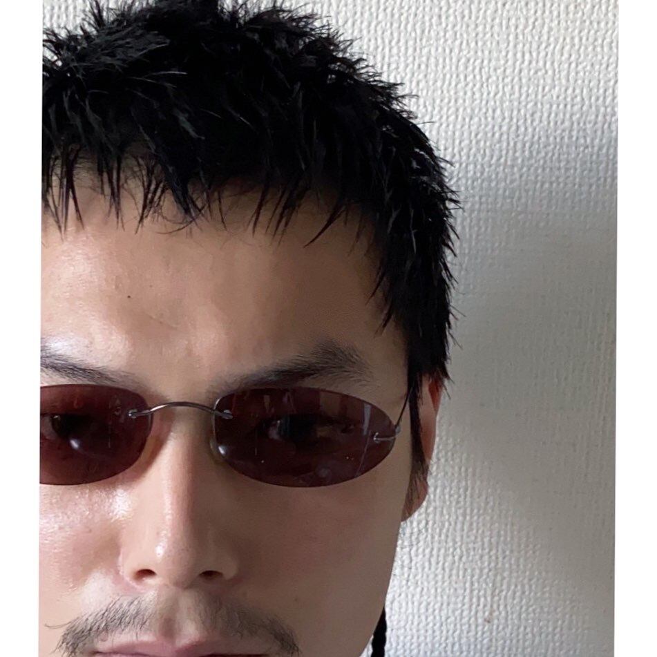 少し垂れ気味の横長ラウンドリムレスレンズ 濃いパープルブラウン系 縁無しで極細のマッドシルバーテンプルが効いています