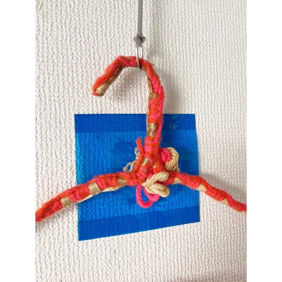 ペーパー素材でコーティングされたハンガーの上から、オレンジ、ヴィヴィットピンク、ベージュの系で編み込まれたハンガー