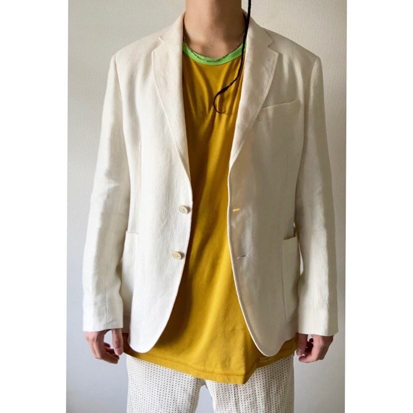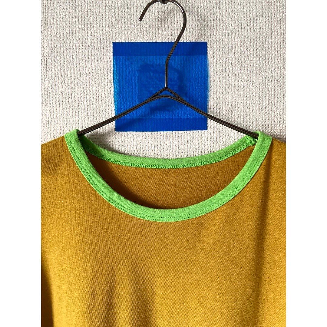 マスタードイエローボディーに袖口、首元はネオンイエローの切り替え 裾の貼り付けられた布がアクセントに