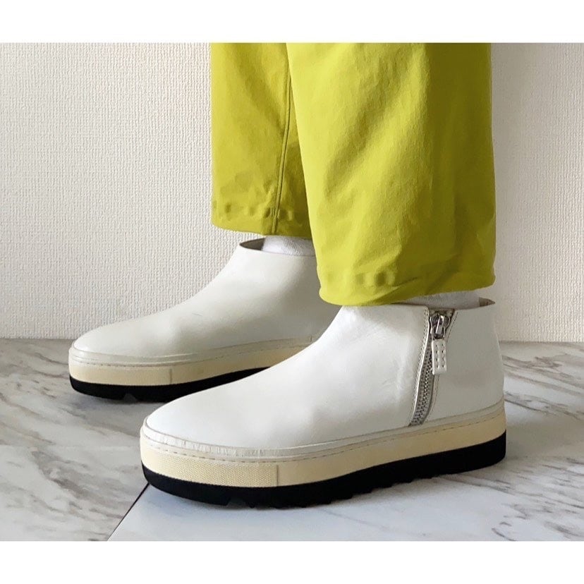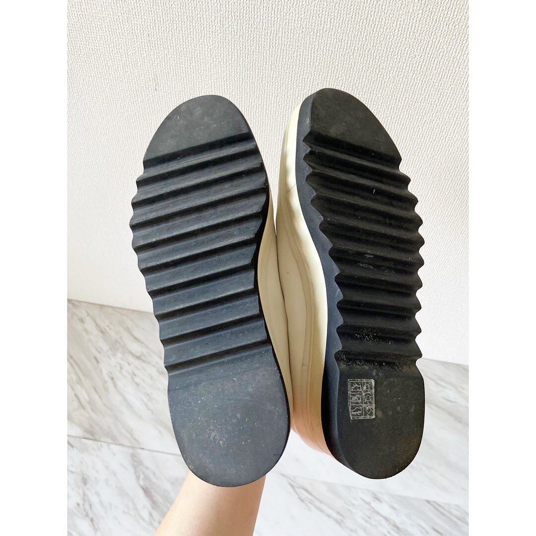 鮮やかなホワイトレザー 生成りっぽいサイドソール+シャークソープ(ゴジラソール)の2重層のかなり高めのソール設計