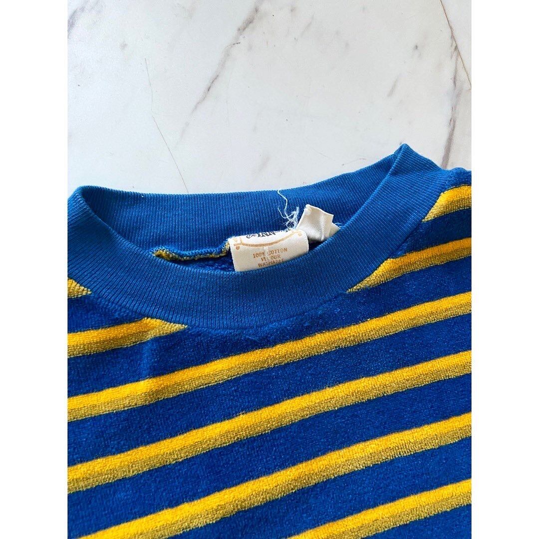 イエロー×濃いブルーのボーダー イエロー部分の濃淡のあるグラデーション 首、裾リブは若干ボディーと色味の異なったロイヤルブルー 首の詰まりも良し このタイプで腕部分リブ無しは珍しい 腕がきゅっとなるのが苦手な方にもおすすめです