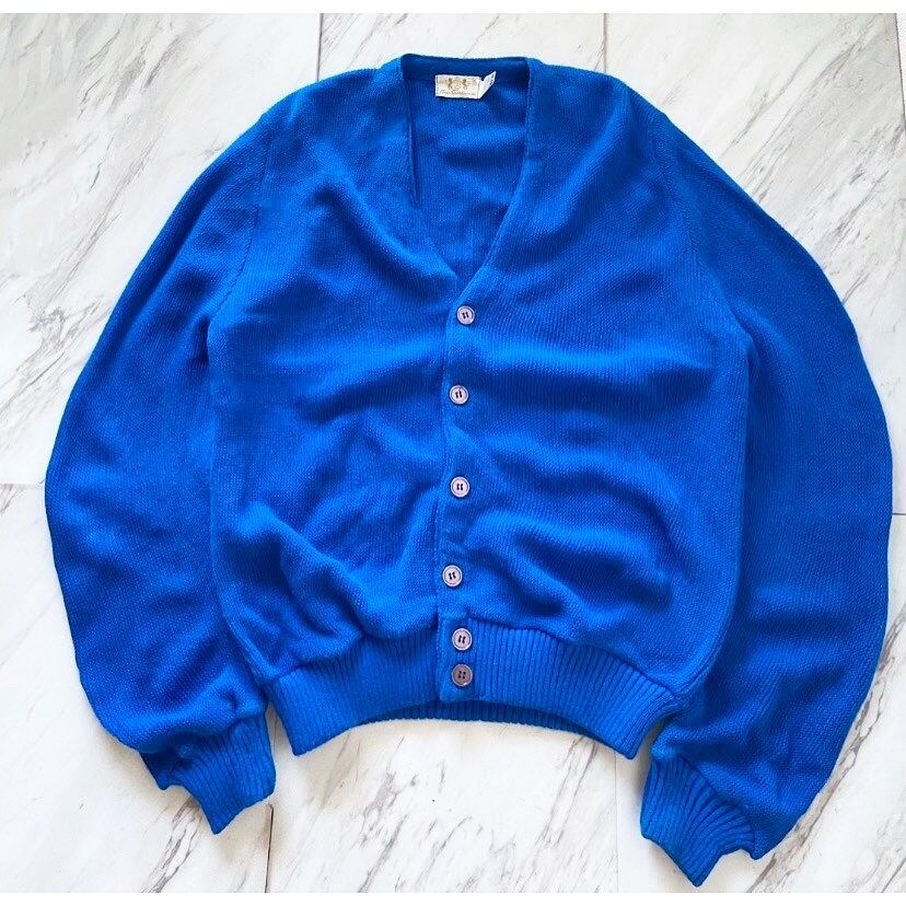 ニット、カーディガンというよりは服としてみないカラーリング 目の覚める様な冷たい表情のロイヤルブルー 銅色のボタンも良し