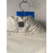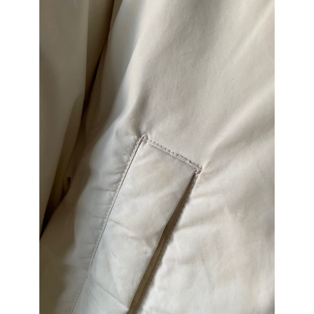 オフホワイトのハリのあるナイロンコットン アームにフェルト地のロゴタブ付き 胸ポケット 裾フラップスナップポケット 裏側にスナップとドローコードが付いているのでウエストでキュッと絞ってボディーのラインを出せます