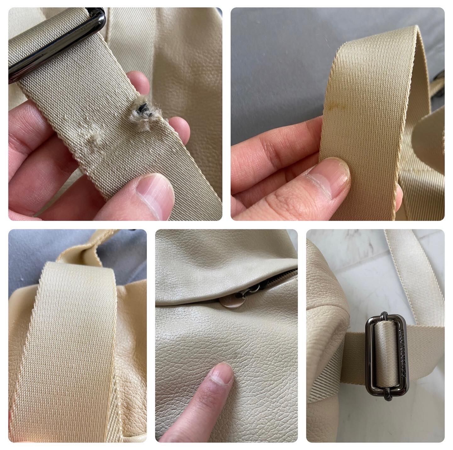 ベルト部分に小汚れ 左ベルト側部にほつれがあります フロント右側に薄く小さいシミ その他小さな古傷など