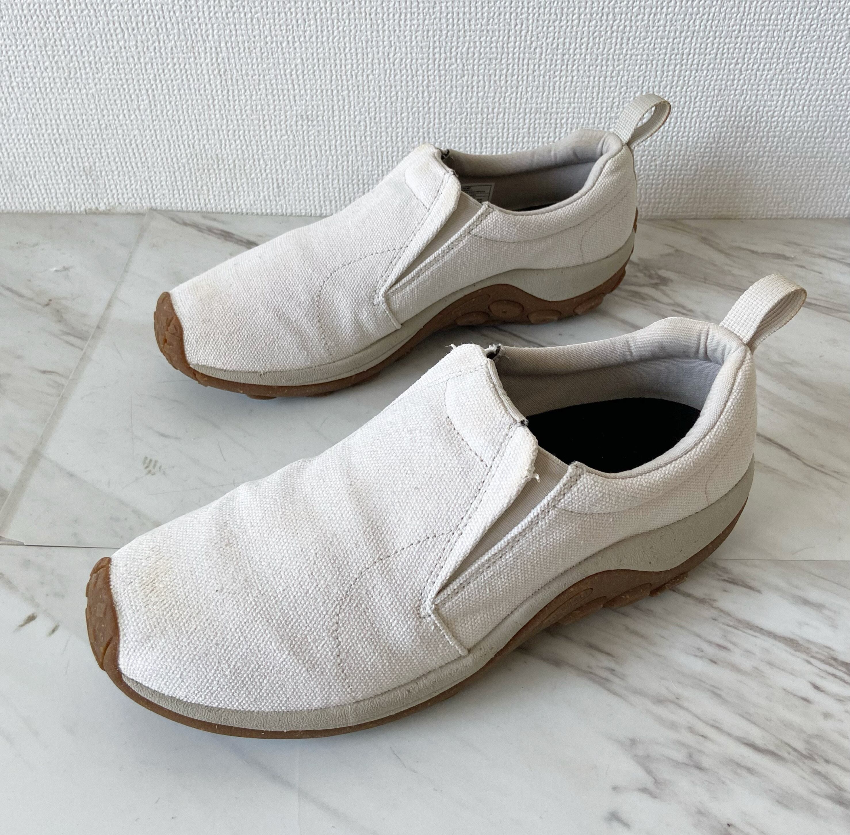 両つま先に薄く黄ばみ部分、 フロントとかかとにとっても薄くですが黄ばみ? 履き口フロントに若干黄ばみ 目立つ物ではありませんが、洗った時に日向干しで出来た物なので、もう一度お酢と石鹸で磨けば落ちるかと思います 若干ですが、生地な糸出があります