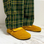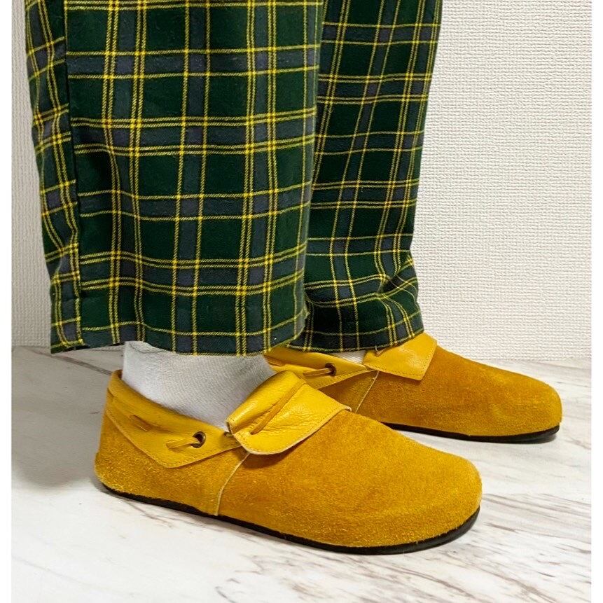 マスタードイエローの起毛したスエード×十分に鞣されたとても柔らかいレザーの切り替え