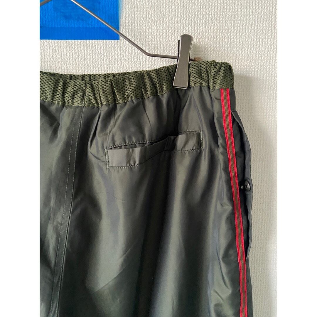 玉虫色がかったオリーブグリーンナイロンポリシェル 細めの赤とカーキのサイドライン