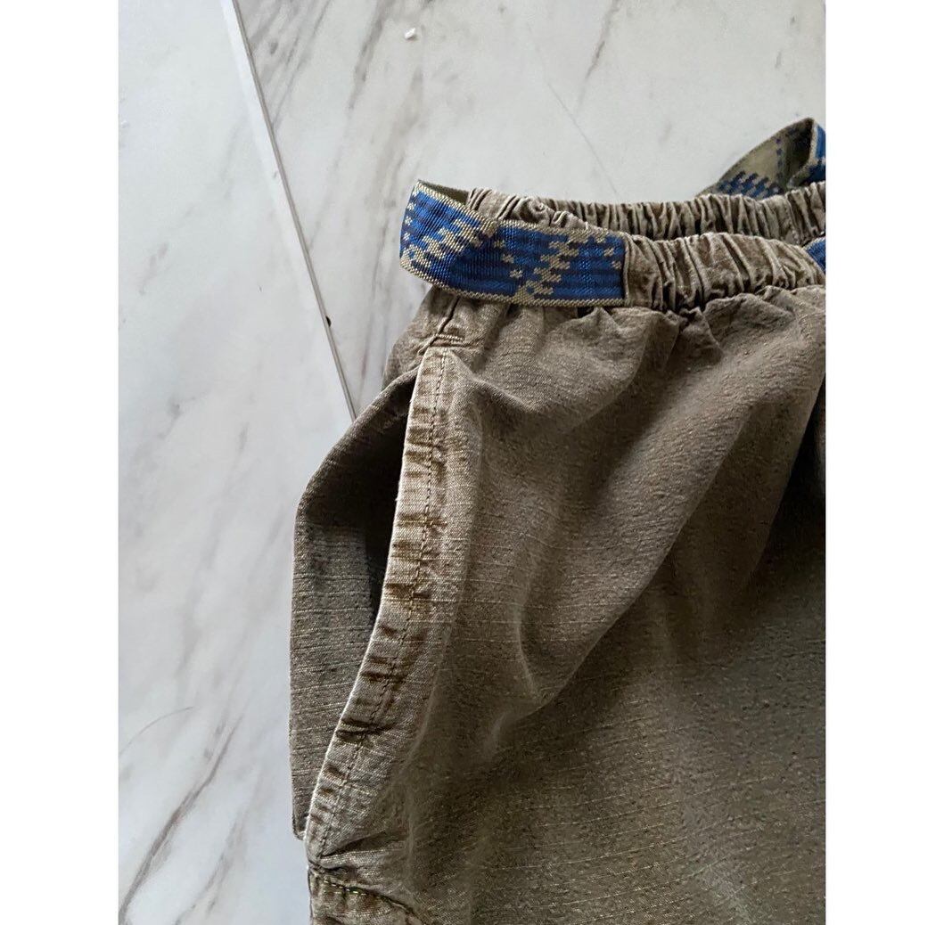 ピグメントダイの様な製品染めによるムラのある表情をしたオリーブグリーン ブルーのチロリアンテープアジャスターが映えます