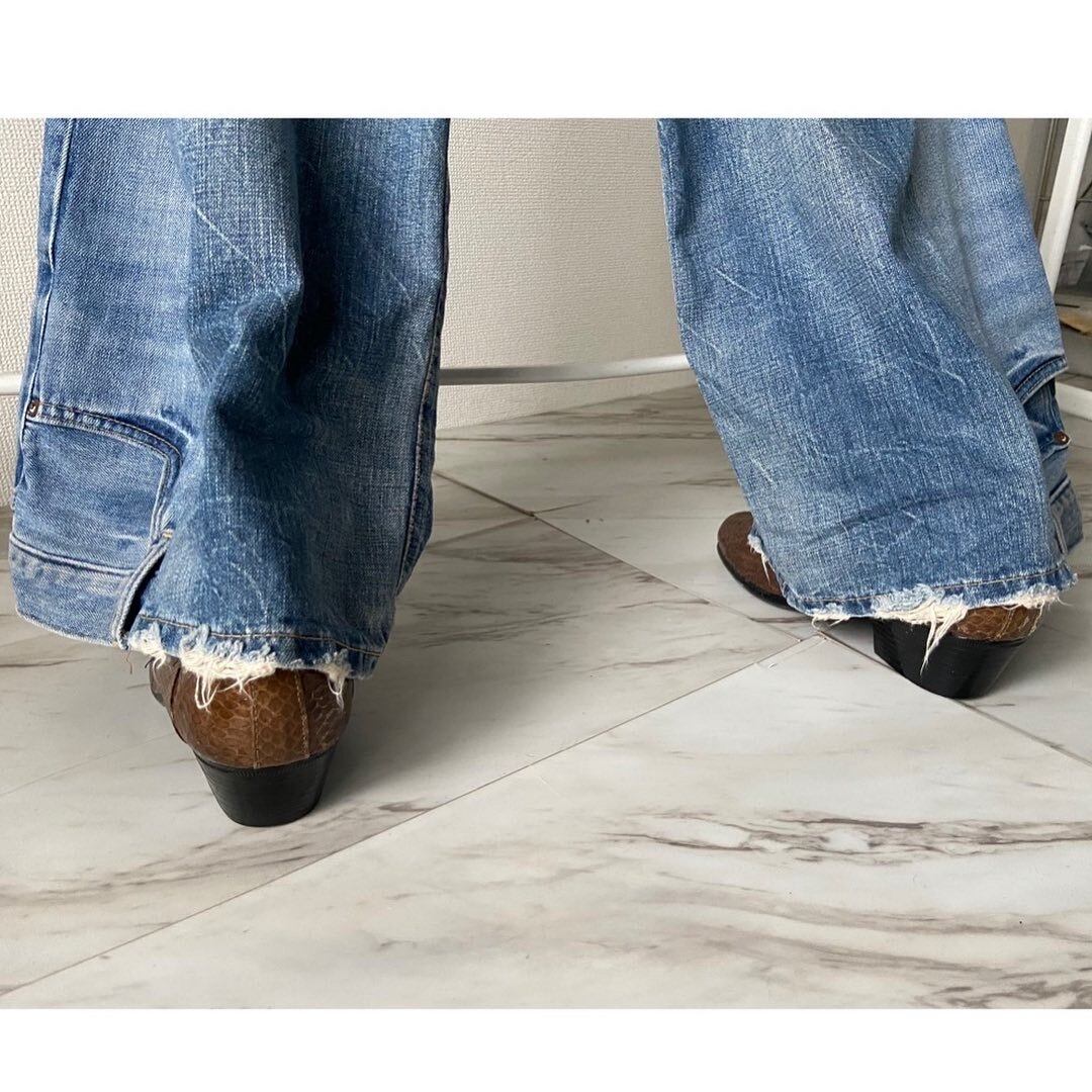 解体後再構築された上下逆さまになったデニム2本の贅沢なリメイク ケツポケが裾に来る感じが面白いですね