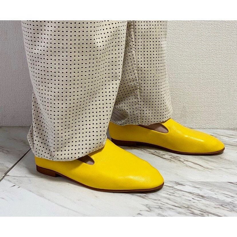 目の覚める様なヴィヴィットイエロー シボ感のあるフェイクレザー 本革ではないので、ガシガシ履けます