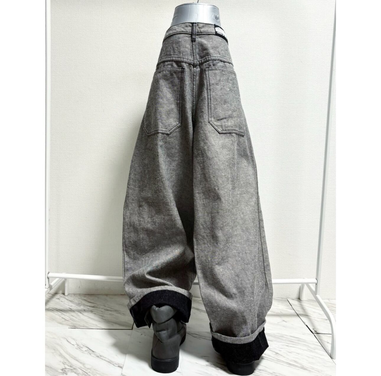 無機質なシルバーカラー 裏側が先染めブラックとなっているので、ロールアップすると裾がバイカラーに 元々股下が80cm以上あったのでロールアップしてちょうど良いくらいにリレングス致しました
