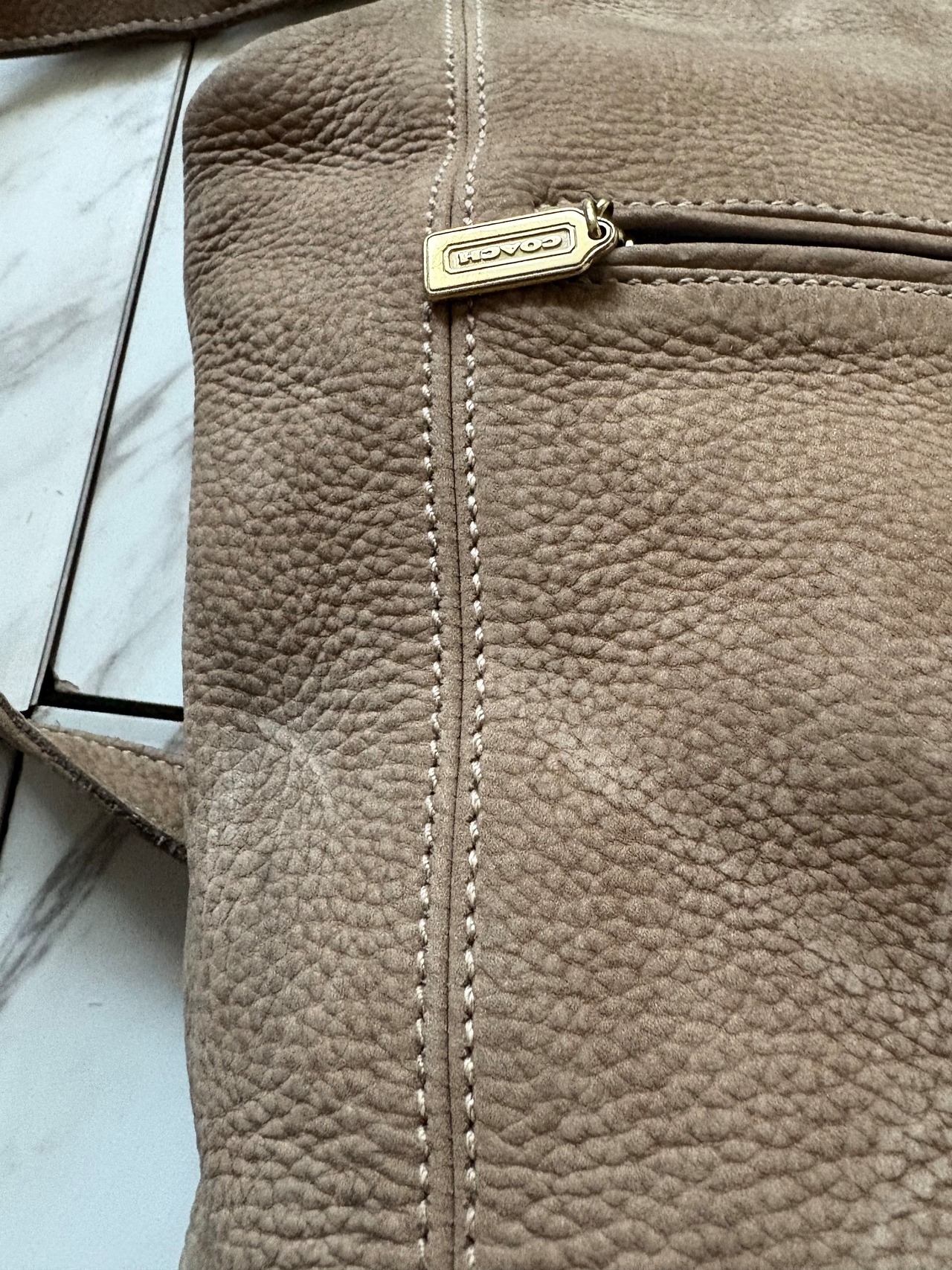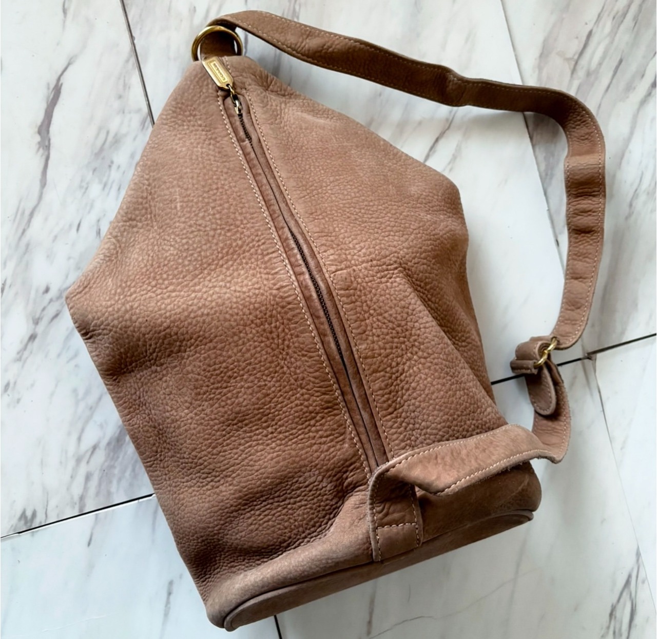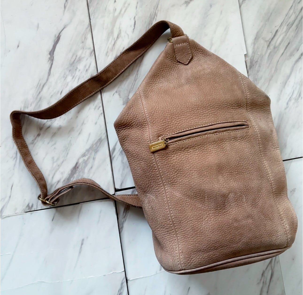 ブラウンベージュ 凸凹とシボ感強めのヌバックカウレザーにゴールドのジップストラップが映えますね ダブルジップポケット